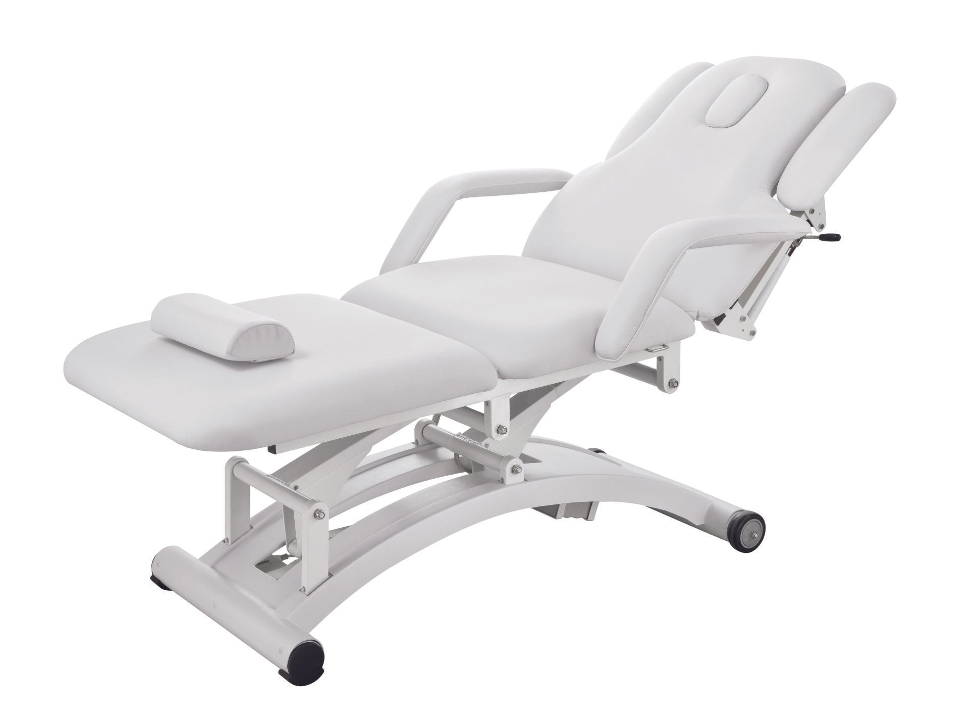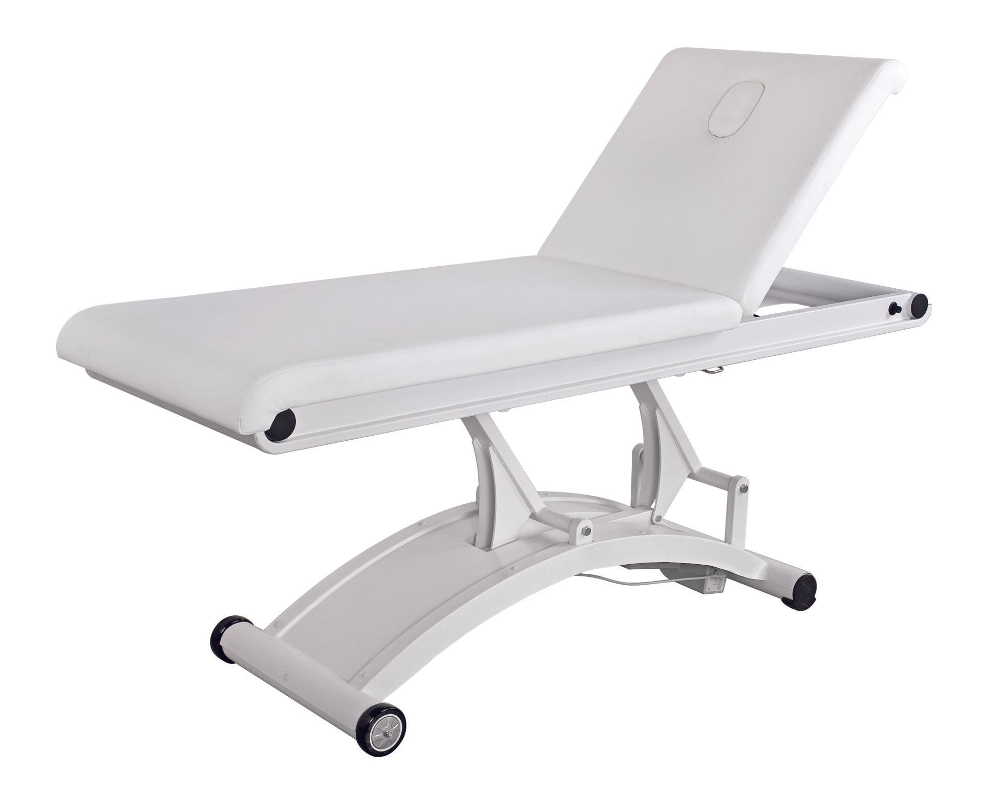 di alta qualità. Materasso in un unico pezzo con 3 sezioni e riscaldamento incluso. Braccioli regolabili e poggiatesta con foro facciale. Dotato di ruote